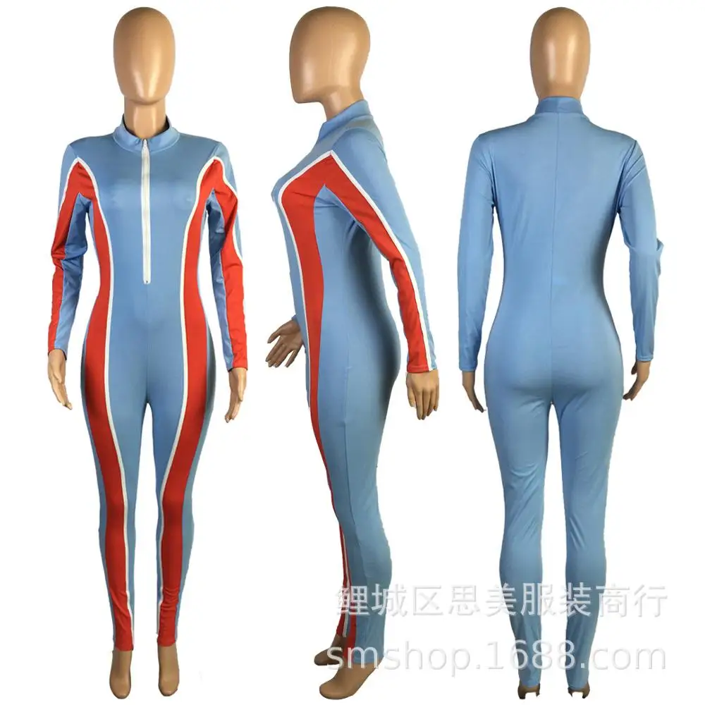 Echoine Striped Patchwork Women Skinny Jumpsuit Zipper V-neck Rompers Sportwear Slim Bodycon Club Outftis Body Playsuit New
