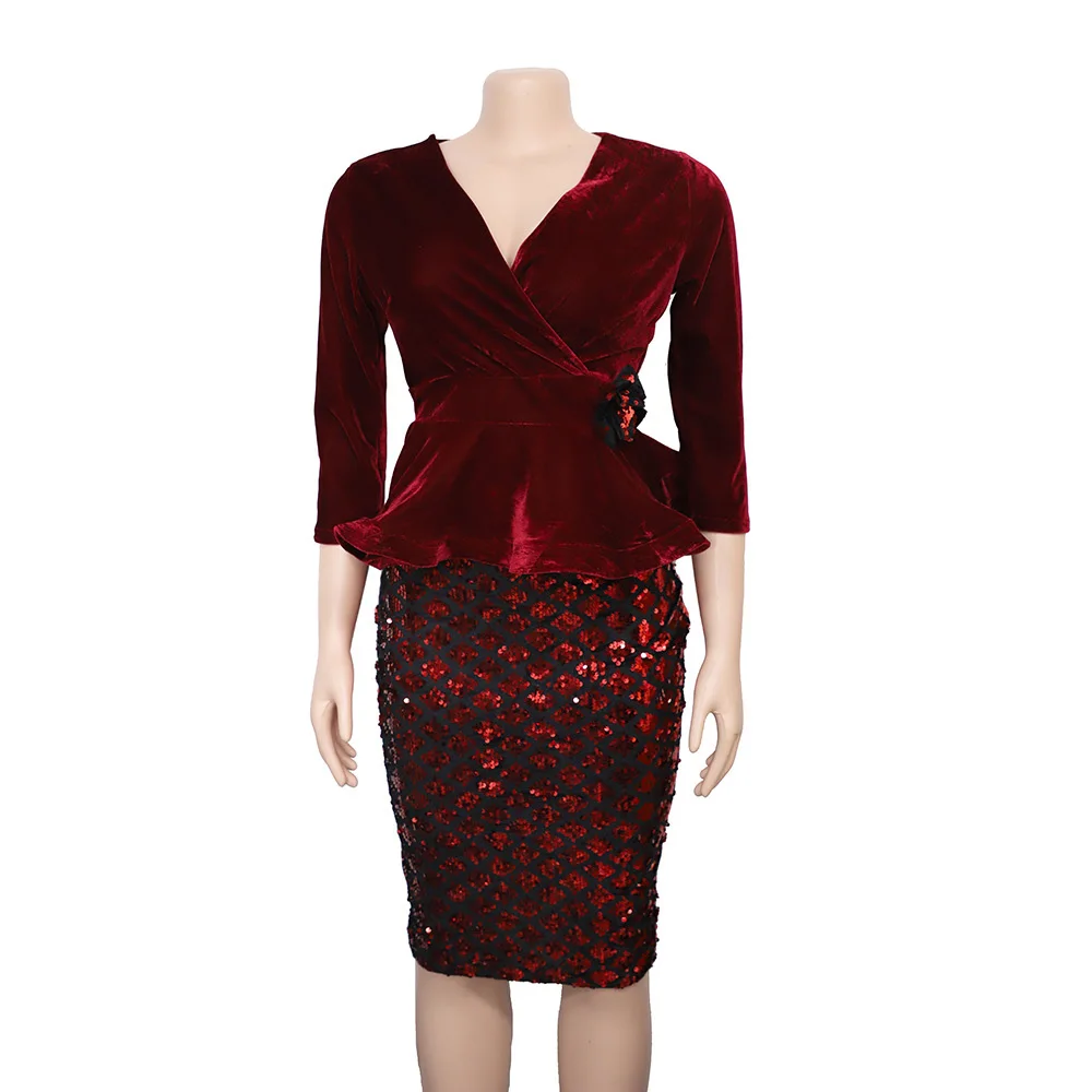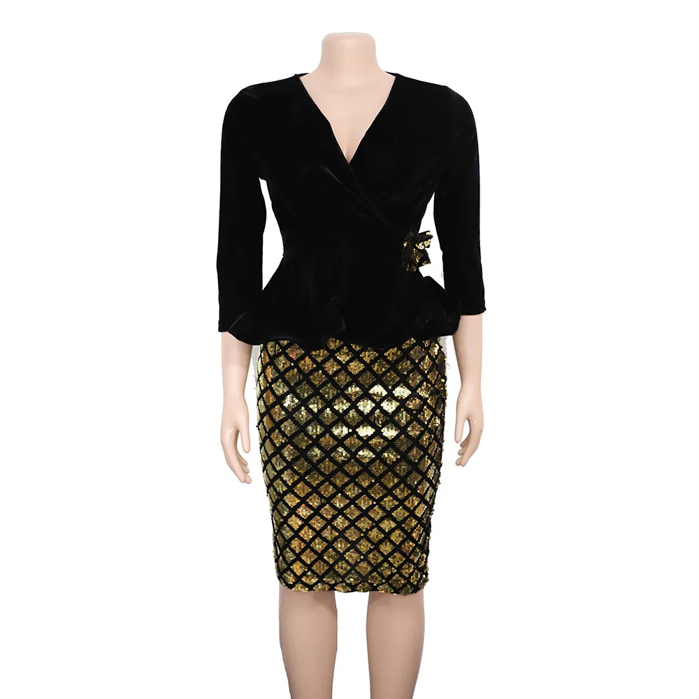 Vintage Two Piece Set Elegant Solid Velvet Tops and Sequins Plaid Skirt Women Sets Office Ladies Party Dinner Suits Plus Size