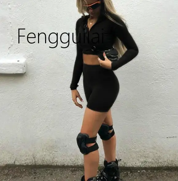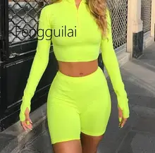 It's better for you to have this 2020 Hot sale Two Piece Set Fluorescent Green Top Shorts Suit Sexy Turtleneck Long Sleeve Bodycon Sport Suit Casual Femme Tracks.