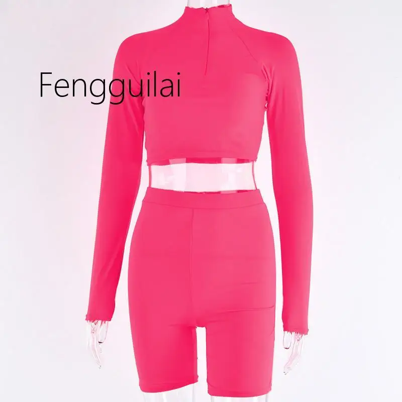 2020 Hot sale Two Piece Set Fluorescent Green Top Shorts Suit Sexy Turtleneck Long Sleeve Bodycon Sport Suit Casual Femme Tracks