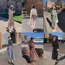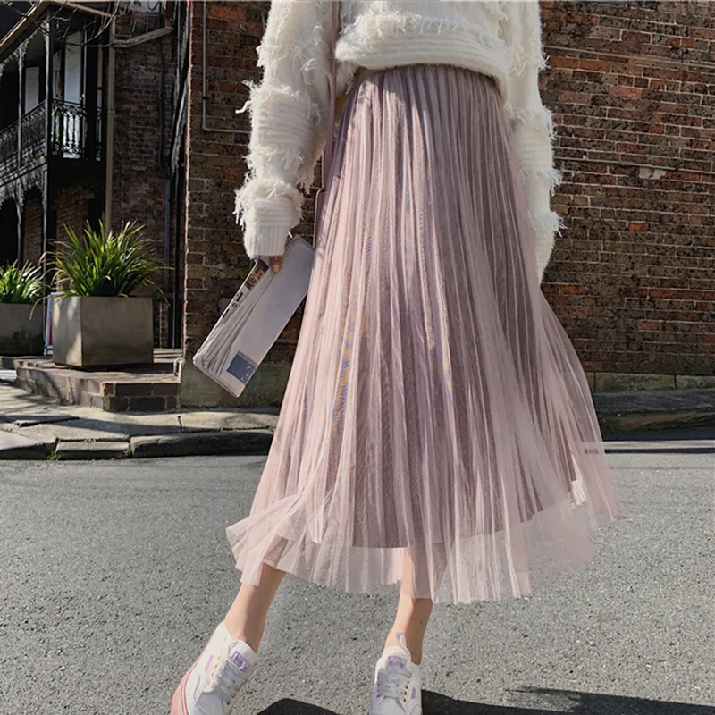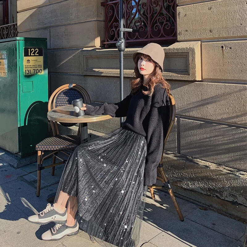 It's better for you to have this Women Long Mesh Pleated Skirt with Liner Winter Spring Casual Elegant Sequins Tulle Skirt High Waist Women Fashion Skirts 2019.