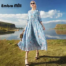 Ramie dress female spring new dress street style round neck loose seven-point sleeve printed A word dress S-XL