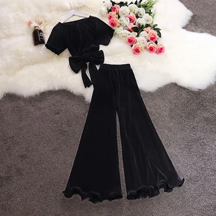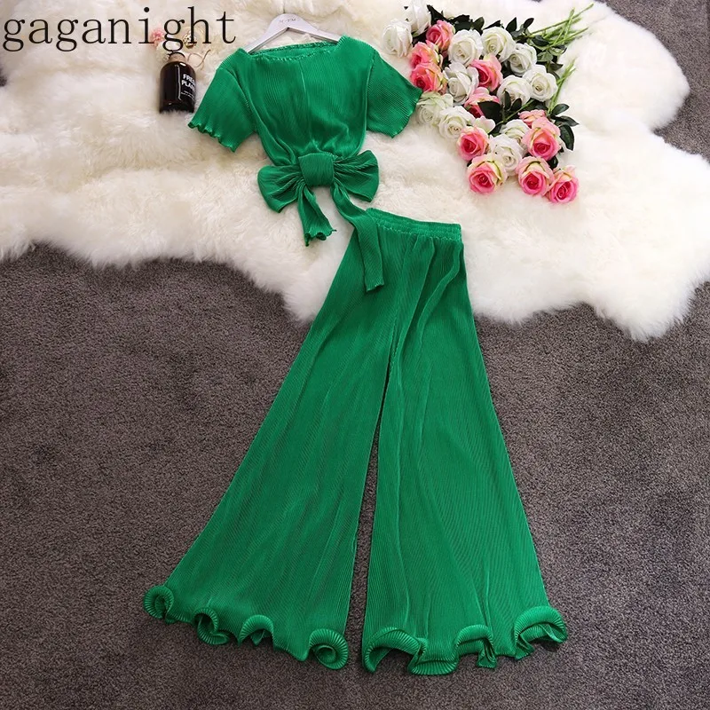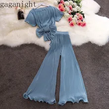 Gaganight 2019 Casual 2 Piece Set Women Two Pieces Set Short Sleeve Chiffon Blouse Flare Ruffle Wide Leg Pants Suit Thin Outfits