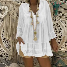 2020 Women Lace Hollow Shirts Dress Long Sleeve V-Neck Pleated Loose Dot Mini Dress Female Sexy Blouse Vestido Plus Size