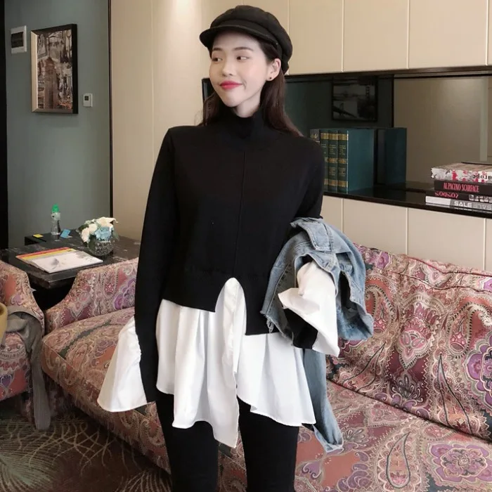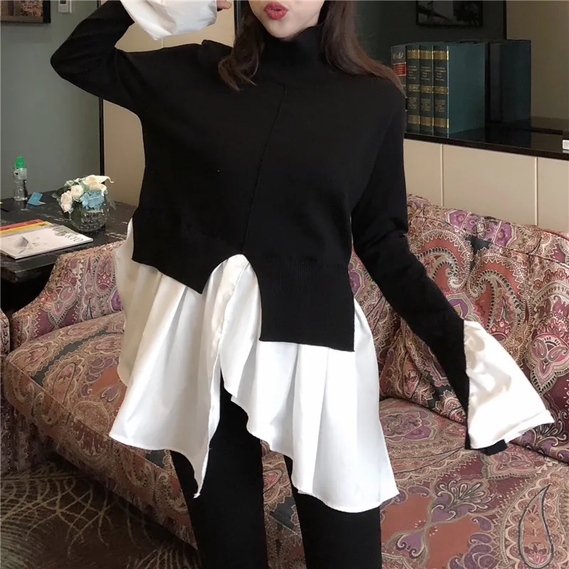 Patchwork Pullovers Knitted Sweater For Women Turtleneck Flare Sleeve Irregular Female Jumper Sweaters Female 2019 Fashion New